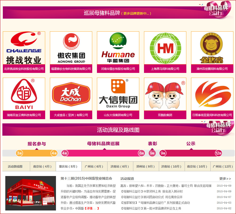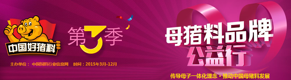由中國飼料行業信息網舉辦的中國好豬料·第三季開啟一次全國性的“母豬料品牌公益行”活動,匯集中國知名母豬料品牌在2015年畜牧行業各大展會、種豬拍賣會等聯合展播,軌跡遍布華東、華中、華南、西南、西北,與業內精英共話母豬料營養。