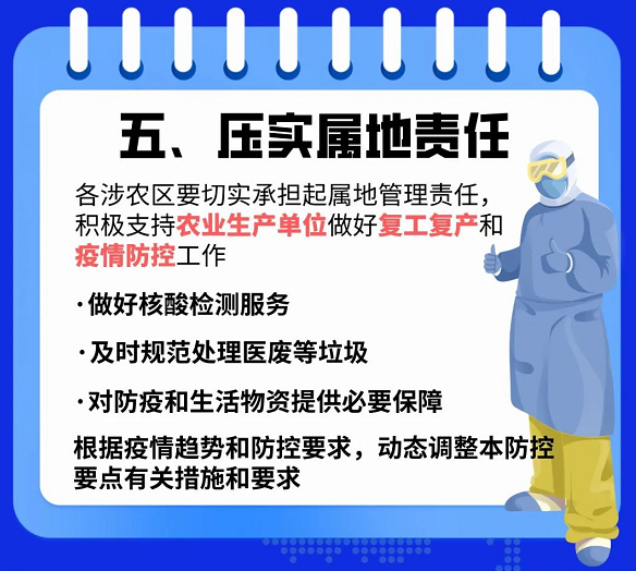 您當前所在位置:首頁 > 新聞中心 > 行業資訊 行業資訊 一圖讀懂 | 上海市農業生產單位復工復產疫情防控要點 在采取嚴格的閉環管理,做好人員消毒、環境和車輛消殺工作,并按時做好必要的核酸檢測和抗原檢測后,是可以保證產品供給安全和穩定的。 分享到:點擊次數: 更新時間:2022-04-26 17:30:18 【打印此頁】 【關閉】 上一條:五一國際勞動節 | 向最美勞動者致敬! 下一條:兩部委:畜禽養殖場所和飼料獸藥生產、屠宰加工企業采取閉環管理,獸藥、動物疫苗等物資經規范消殺后允許流通