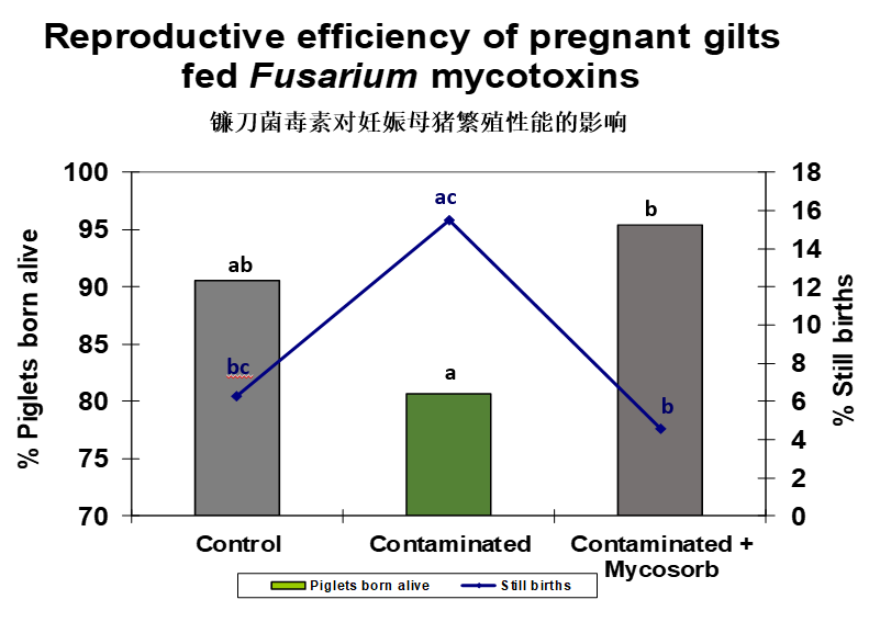 Diaz and Smith等(2006)使用EGM(商品名霉可吸或Mycosorb,奧特奇)研究表明,在含有嘔吐毒素污染(5500 ppb DON+500 ppb 15-Ac-DON+300 ppb ZEA)的妊娠母豬日糧中,添加2 kg霉可吸,可以降低母豬分娩時體重損失,提高飼料轉化效率,降低死胎比例(圖3-4) 。此外,霉可吸在提高動物免疫性能、降低炎癥反應、緩解氧化應激等方面也有顯著作用 (Van Le Thanh et al., 2015; Weaver et al., 2014) 。